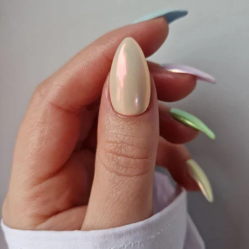An apple pastel green chrome powder which creates a golden green shine on your manicures.